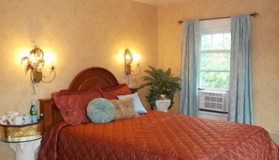 Upon entering the Venice room one has the feeling of being directly on a side street of the Canal Grande due to the full wall mural complete with gondola and gondolier. The bed is outfitted with new Serta posturepedic mattresses and is very comfortable. A small closet is available and fold out tables for guests bags or personal items are provided. If you enjoy the evening sun this is a good choice. Venetian masks, Venetian plaster and fixtures with crystal beads complete the Italian look.